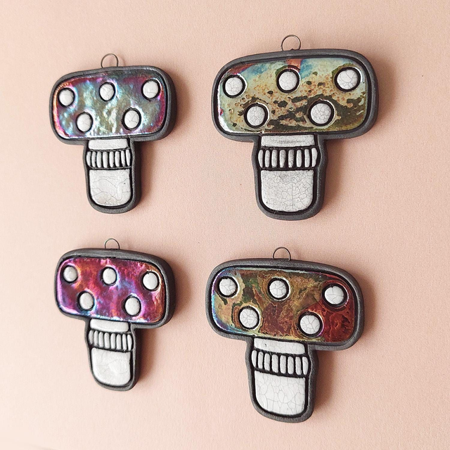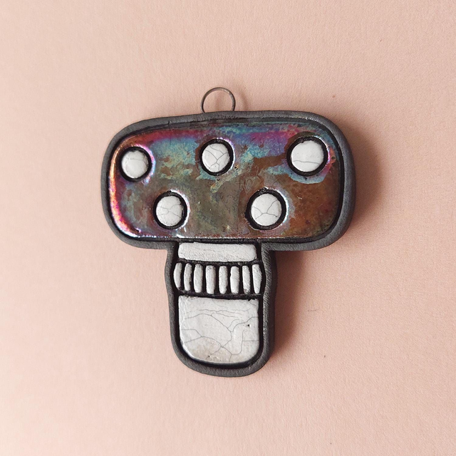 Brighten your plants with this handmade ceramic mushroom, crafted using the traditional raku firing technique. The glaze features crackle patterns and colors that vary from rainbow tones to coppery browns, making each ornament unique and eye-catching.