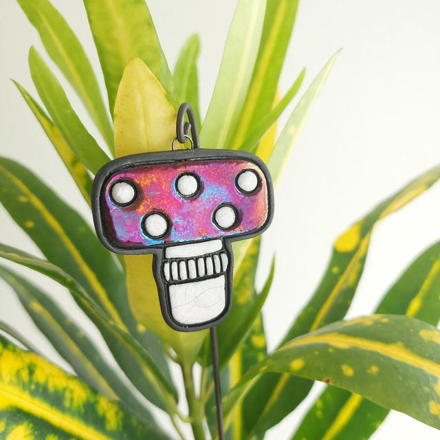 Ceramic Mushroom Plant Stake - Rainbow Garden Decor - Raku Ornament