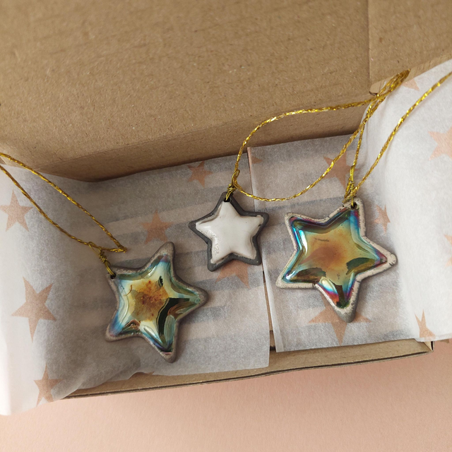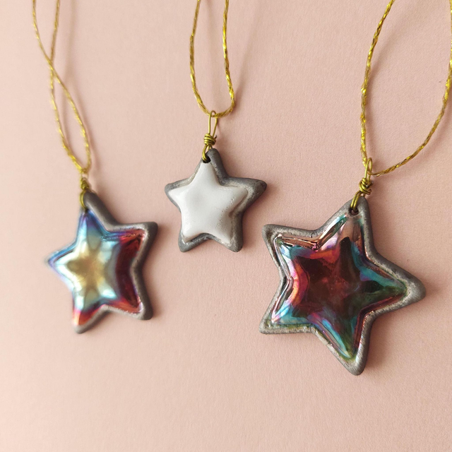 Ceramic star decoration - Iridescent star decor - Rustic handmade star set - Glass star ornaments