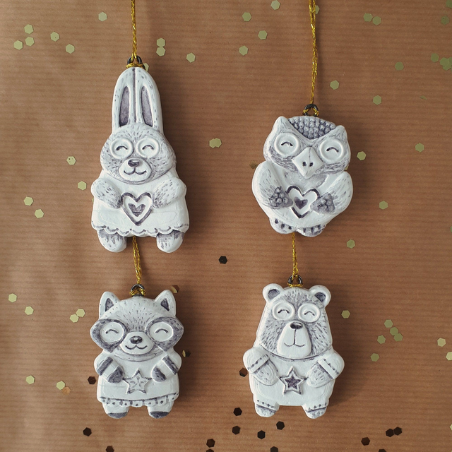 Handmade bear figurine for your autumn/spring/Christmas tree. Rustic vibe guarantee. Made of air dry clay, painted and covered with varnish. A heart-warming gift for your beloved ones. Goes very nicely with sisal fibers. Ornaments come in a nice box, laid on silk paper. Each ornament is lightweight, weighing about 20g.