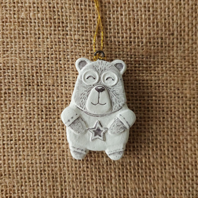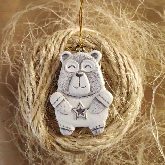 Clay bear ornament - Tree decoration - Grizzly bear figurine - White Christmas decor
