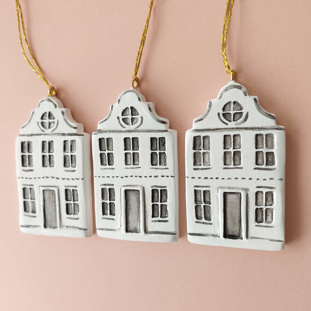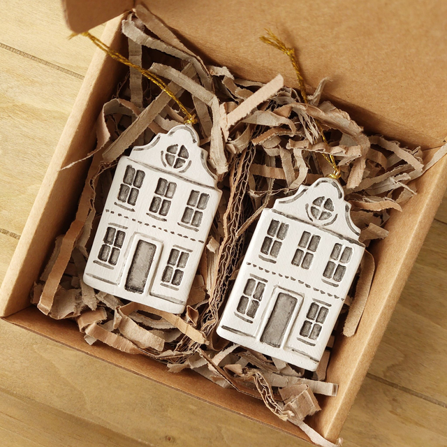 Handmade Dutch house clay decoration for your autumn/easter/Christmas tree. Set of 2 items (available to be purchased as a single one as well). A funny and cheeky gift for your beloved ones. Ornaments come in a nice box, laid on silk paper. Each ornament is lightweight, weighing about 15g.