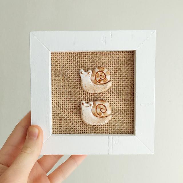 Handmade framed wall art. This piece is called "Two friends". The snails are very shiny. :) The work is ready to be hanged.