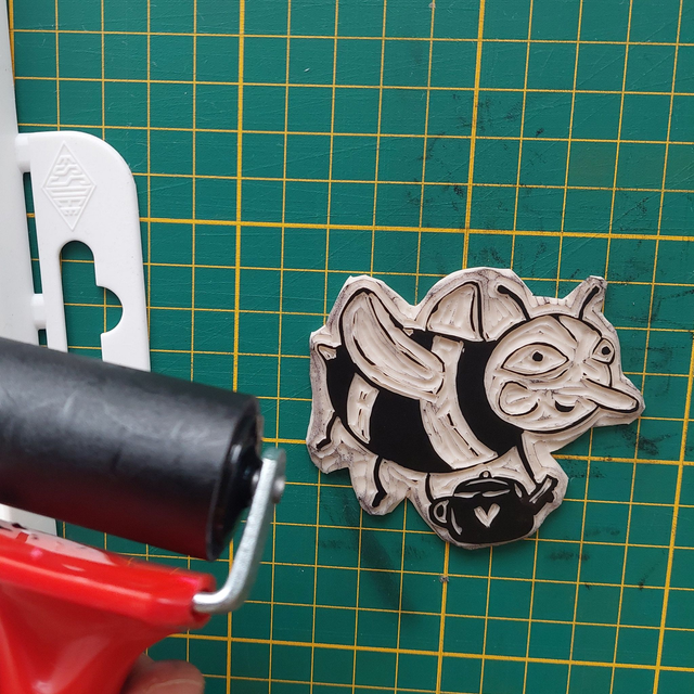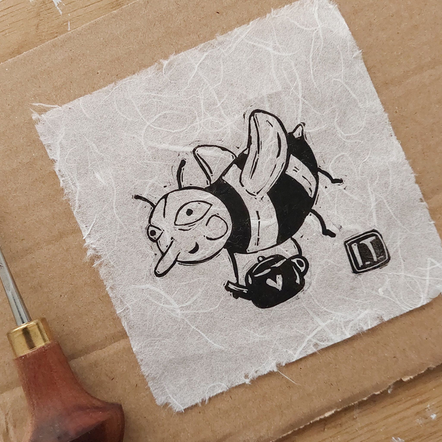 Honey and Tea - linocut bee - Handprinted bee and teapot