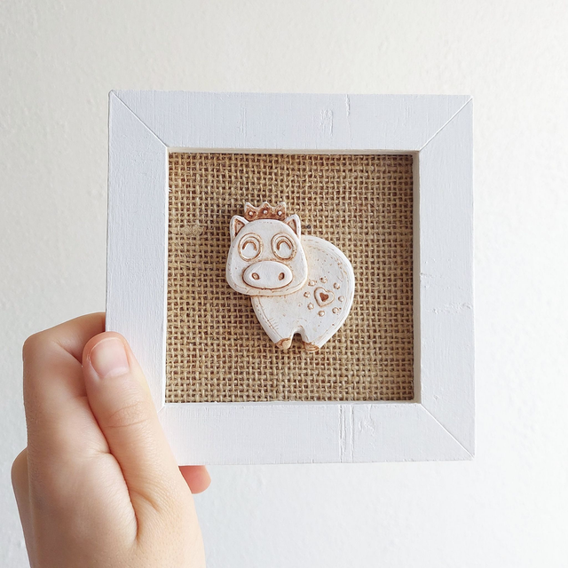 Handmade framed wall art. This piece is called "Piglet". The work is ready to be hanged.