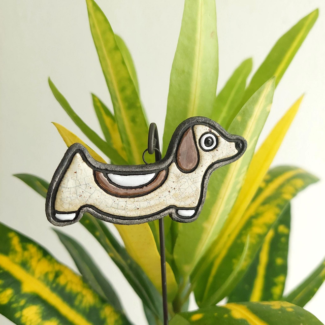 Ceramic Dachshund Plant Stake – Raku Garden Decor - Dog Plant Ornament
