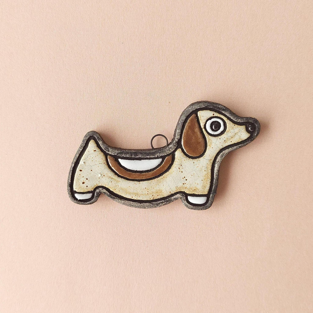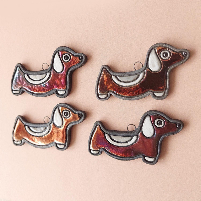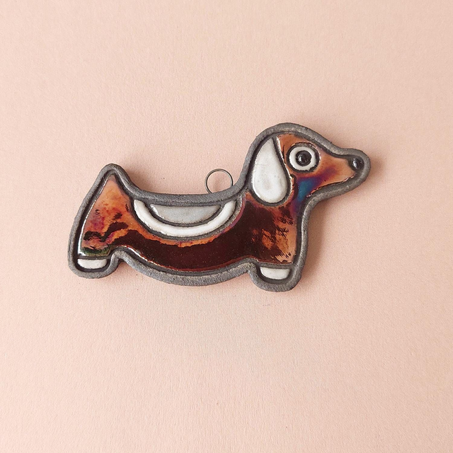 Brighten your plants with this handmade ceramic dachshund, crafted using the traditional raku firing technique. The glaze features crackle patterns and colors that vary from rainbow tones to coppery browns, making each ornament unique and eye-catching.